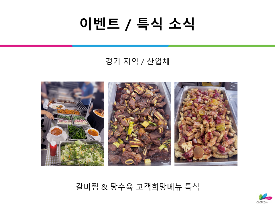 이벤트 / 특식 소식 _ 경기 지역 / 산업체 _ 갈비찜 & 탕수육 고객희망메뉴 특식 등록일2025.09.19 조회수35 댓글 0댓글쓰기 댓글목록 등록된 댓글이 없습니다. 이전글 이벤트 / 특식 소식 _ 인천 지역 / 산업체 _ 명절맞이 뽑기 이벤트 다음글 이벤트 / 특식 소식 _ 경기 지역 / 산업체 _ 스테이크 & 양식 세트메뉴 특식 목록
